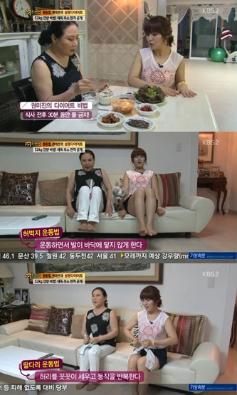 2일 오전 방송된 KBS '여유만만'에 출연한 권미진은 다이어트 요요현상으로 고생하는 곽정희에게 다이어트 비법을 전수했다.