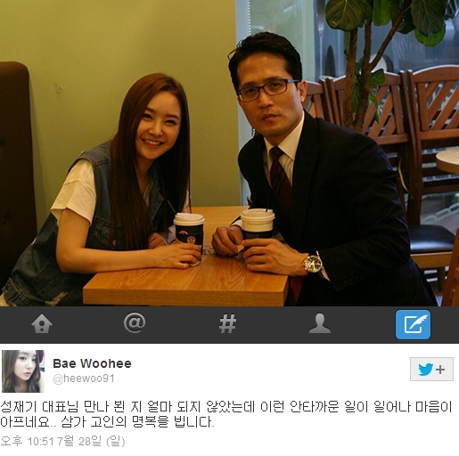 우희는 29일 자신의 트위터에 "성재기 대표님 만나 뵌 지 얼마 되지 않았는데 이런 안타까운 일이 일어나 마음이 아프네요. 삼가 고인의 명복을 빕니다"라는 글을 통해 애통한 심경을 밝혔다.