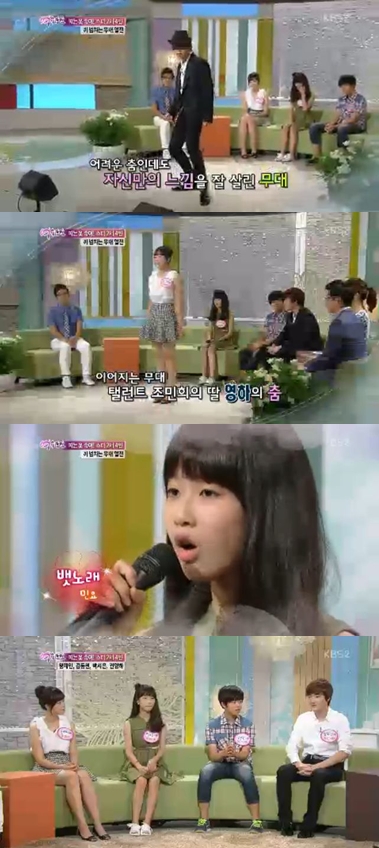 2일 오전 방송된 KBS 2TV '여유만만'에서는 방송인 김구라 아들 김동현, 아나운서 왕종근 아들 왕재민, 가수 박남정 딸 박시은, 탤런트 조민희 딸 권영하가 출연해 춤이면 춤 노래면 노래 예비만능엔터테이너로서의 면모를 실껏 뽐냈다.