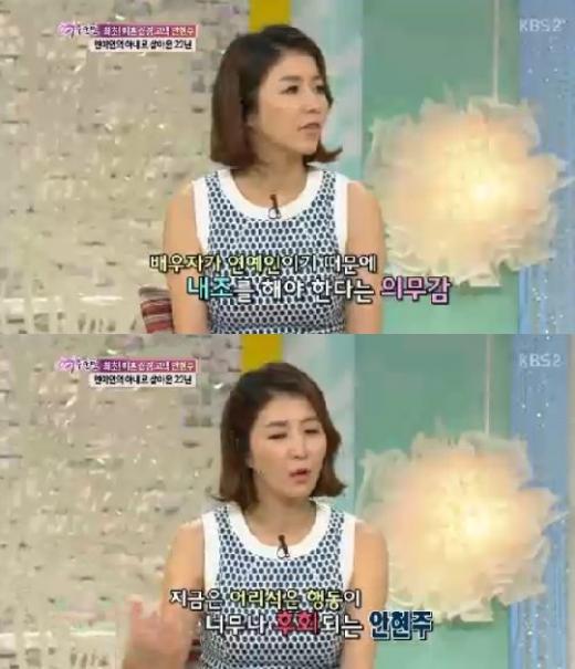 이날 방송에서, 부부생활로 받은 스트레스로 우울증에 시달려 자살 시도까지 했다고 밝힌 안현주는 이혼을 염두에 두고 있는 부부들에게 현실적인 조언을 전했다.