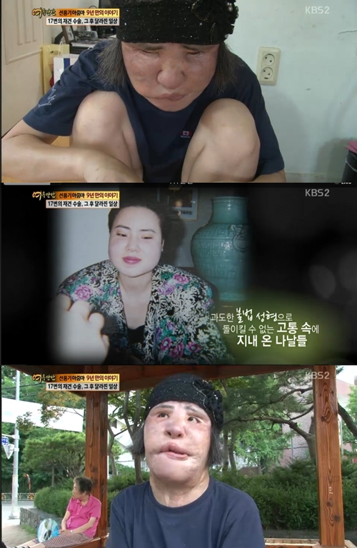 27일 오전 방송된 KBS 2TV '여유만만'에서 한혜경 씨가 출연해 17번의 얼굴재건수술 후 변화한 일상을 공개했다.