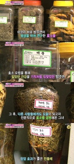 MC 황수경이 "의사 집안인 시댁의 반응이 어땠냐?"고 묻자 이에 방주연은 "처음엔 나를 별종 취급했다. 하지만 내가 암을 고치니깐 이제는 내가 뭘 먹는지 궁금해한다"며 너스레를 떨었다. 방주연은 올해로 33년째 효소를 연구 중이다.