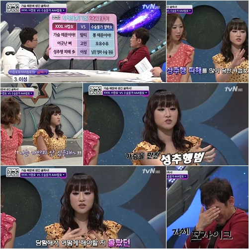 H컵녀는 "어렸을 때부터 그런 일들이 잦았다"며 "지하철 같은 경우에 노출이 없는 옷을 입었는데도 누군가가 뒤에서 내 가슴을 만지고 있었다"고 말해 놀라움을 안겼다.