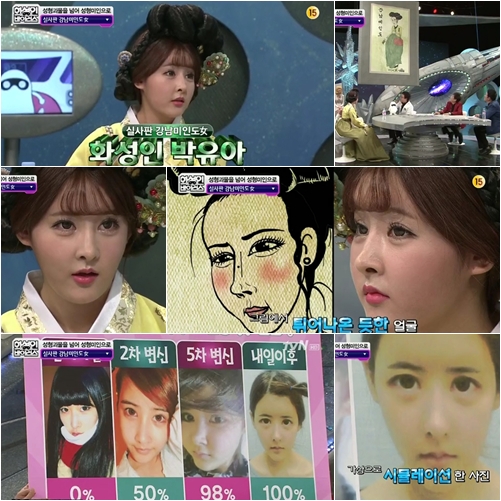 박유아 씨 역시 자신을 성형미인이라고 말하며 강남미인도女와 더욱 흡사한 외모를 갖기 위해 여전히 성형수술을 진행 중으로 알려져 MC들을 경악케 했다.