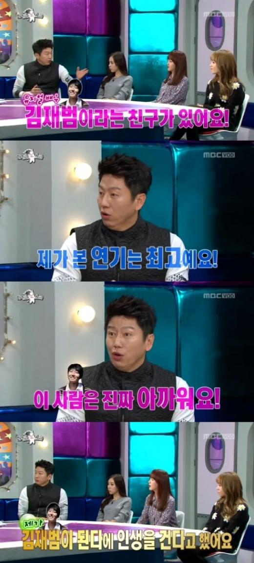 MC 김국진은 "솔직히 잘 될 거라 얘기했는데 안 된 친구도 있지 않냐"고 물었고 김수로는 "김재범이라는 친구가 있는데 내가 본 연기는 최고였다"며 "진짜 아까운 친구다. '김재범이 된다'에 내 인생을 건다고 했다"고 칭찬을 아끼지 않았다.
