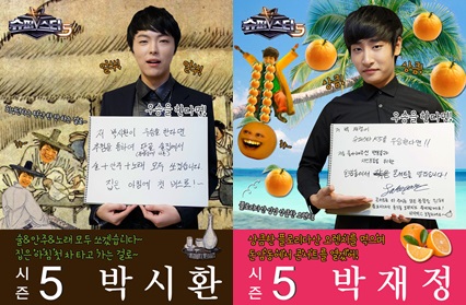13일 '슈퍼스타K5' 공식 페이스북을 통해 공개된 두 장의 사진에는 박시환과 박재정이 각각 자신의 우승공약을 적은 스케치북을 들고 미소 짓고 있다.