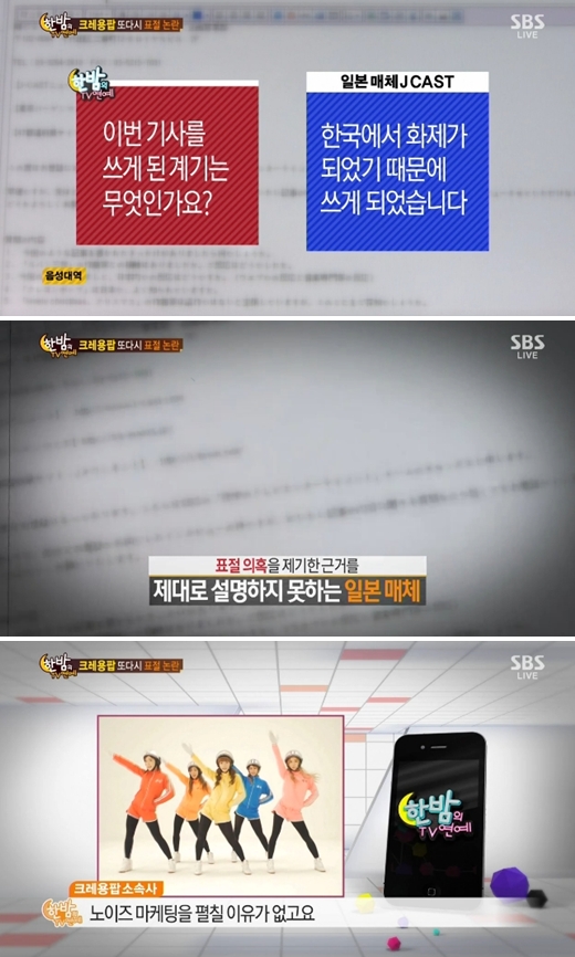 4일 오후 방송된 SBS 연예 정보 프로그램 '한밤의 TV연예(이하 한밤)'에서는 최근 불거진 크레용팝의 '꾸리스마스' 표절 논란을 집중 보도했다.