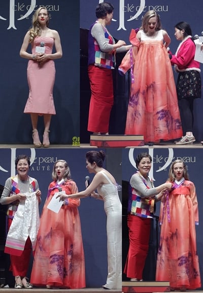 사진 속에는 지난 3일 화장품 브랜드 끌레드뽀 보떼의 초청으로 내한한 아만다 사이프리드가 만찬 행사에서 한복을 착의하는 모습이 담겨 있다.