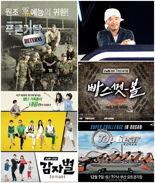 '푸른거탑'(사진 좌측 맨 위부터 시계방향으로), '슈스케5' 이하늘, 곽정환PD의 '빠스껫볼', '탑기코5', 김병욱PD의 '감자별2013QR3' /사진=CJ E&M