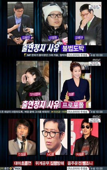 이밖에 개그맨 전창걸은 대마초 흡연으로, 가수 MC몽은 위계공무 집행방해 건으로, 탤런트 여욱환은 뺑소니 건으로 출연 금지됐다.