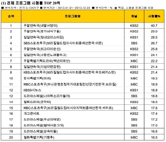 한편 이번 조사는 2013년 1월 1일부터 12월 22일까지 방송된 프로그램을 대상으로 진행됐으며 특집과 스페셜 프로그램은 제외됐다.