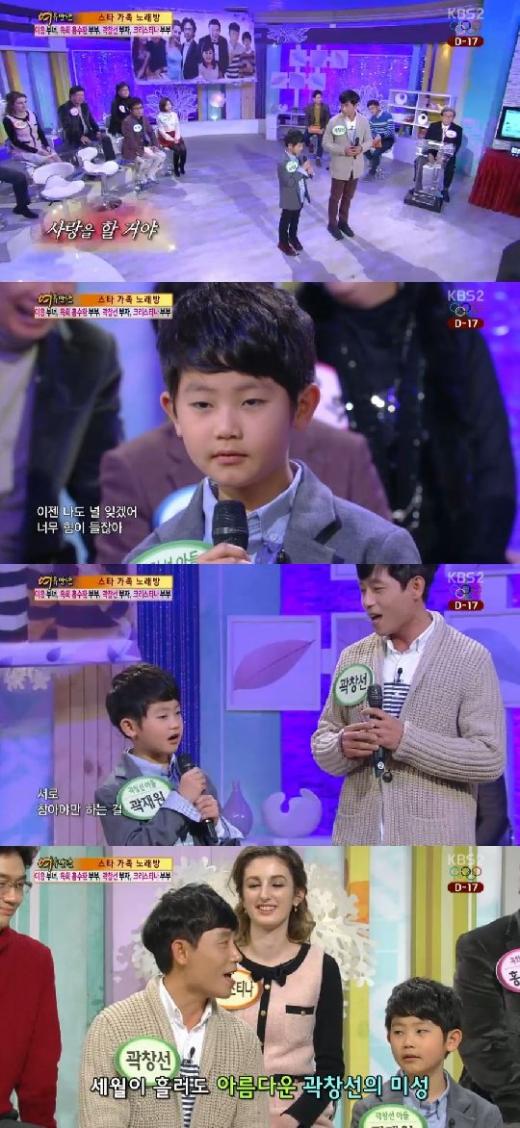 이날 '스타 가족 노래방'의 심사를 맡은 이종수 작곡가는 "어리지만 노래의 맛을 살릴 줄 알았던 훌륭한 무대다. 녹색지대 곽창선의 영향을 받았다"며 아들 곽재원 군의 노래실력을 극찬했다.