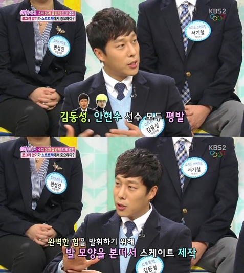 이어 김동성은 "스케이트 종목의 경우 발로 빙판을 박차는 힘이 중요하기 때문에 오히려 평발이 유리하다"며 "나와 러시아에 가 있는 안현수 선수가 평발이다"라고 말했다.