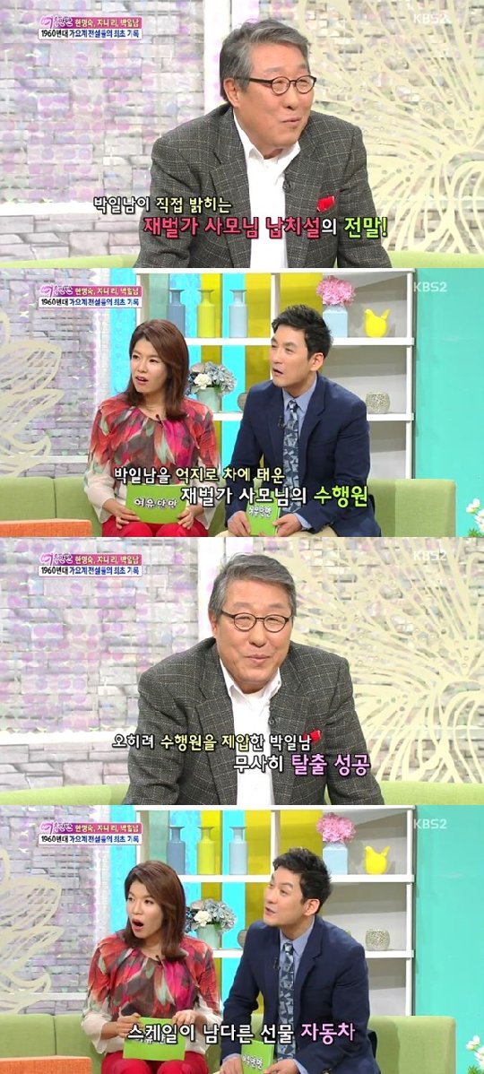 이날 MC 조영구가 "재벌가 사모님에게 납치당했다는 풍문이 사실인가"라고 묻자 박일남은 "그것까진 아니다"라며 수줍게 답했다.