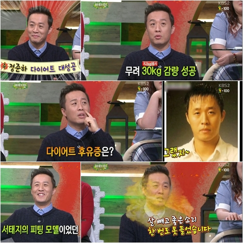 이날 방송에서 정준하는 "최고 체중이 112kg이었고 최고로 많이 82kg까지 뺐다"며 "살을 빼고 나서 얼굴에 주름이 생겨 먼지가 꼈었다"고 너스레를 떨어 웃음을 자아냈다.