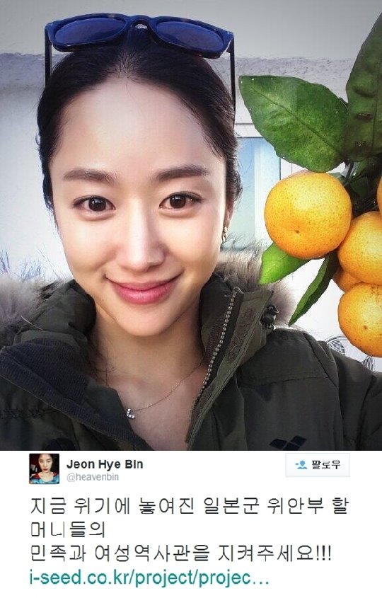 전혜빈은 지난 11일 자신의 트위터를 통해 "지금 위기에 놓여 진 일본군 위안부 할머니들의 민족과 여성역사관을 지켜주세요!"라는 글과 함께 영상을 게재했다.