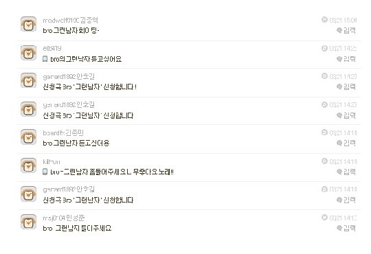이와 더불어 SBS 파워FM '두시탈출 컬투쇼' 신청곡 게시판에도 bro의 '그런 남자'를 신청하는 글이 폭주해 눈길을 끌었다.