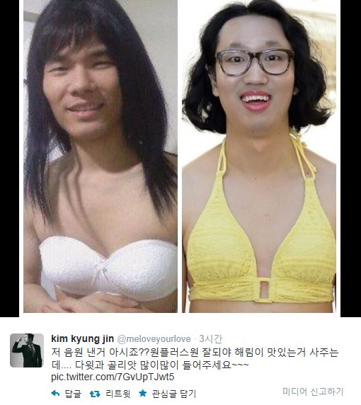 김경진은 글과 함께 개그맨 윤성한과 여장을 하고 찍은 사진도 함께 공개했다. 두 사람은 최근 그룹 '원플러스원'(1+1)을 결성했으며 지난달 20일 싱글 '다윗과 골리앗'을 발표했다.