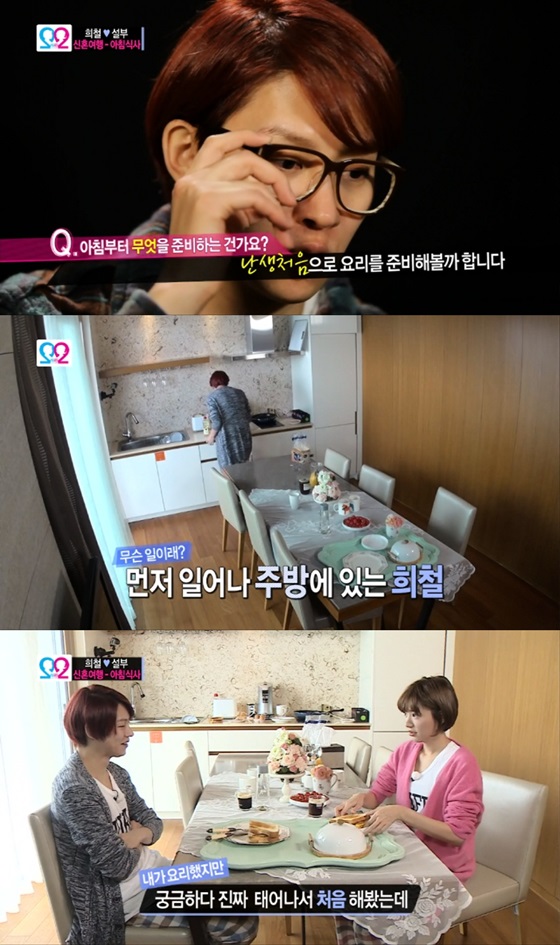 이날 거제도로 신혼여행을 떠난 김희철은 부인인 곽설부보다 먼저 일어나 아침 식사를 준비했다. 토스트, 달걀 프라이, 모닝커피 등 간단한 메뉴였지만 난생처음 요리를 하는 김희철에겐 고난이도 음식이었다.