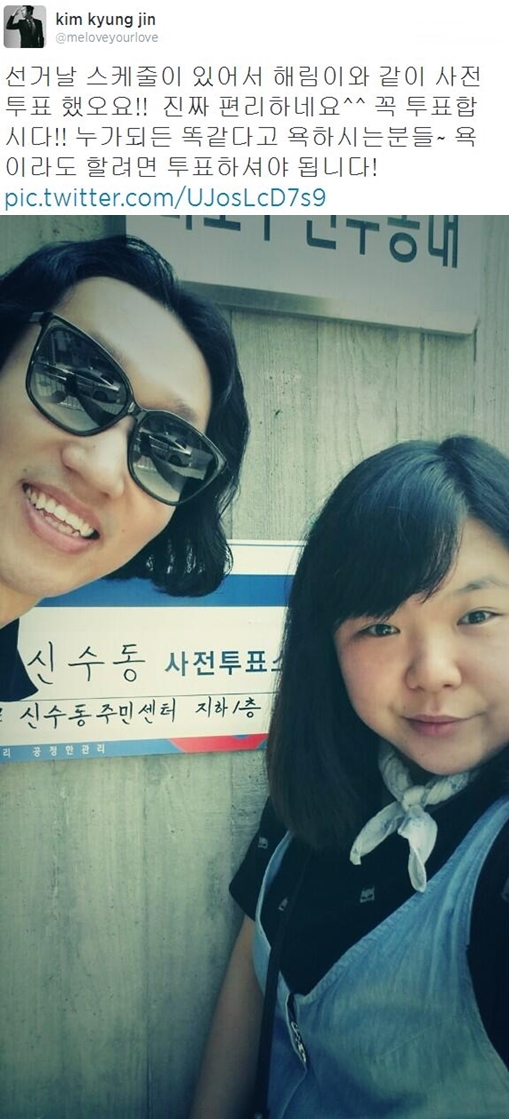 개그맨 김경진과 개그우먼 양해림 커플이 6·4 지방선거 사전투표 인증샷을 공개했다.