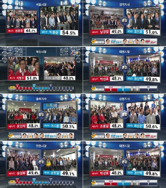 새정치민주연합은 서울 박원순 후보를 비롯해 광주 윤장현, 전남 이낙연, 전북 송하진, 세종 이춘희 후보가 우세하게 나타났다. 새누리당은 경남 홍준표, 울산 김기현, 제주 원희룡, 대구 권영진, 경북 김관용 후보가 우세하다고 집계됐다. 경기 인천 대전 충북 강원 충북 충남 등 7개 지역은 경합지역으로 분류됐다.