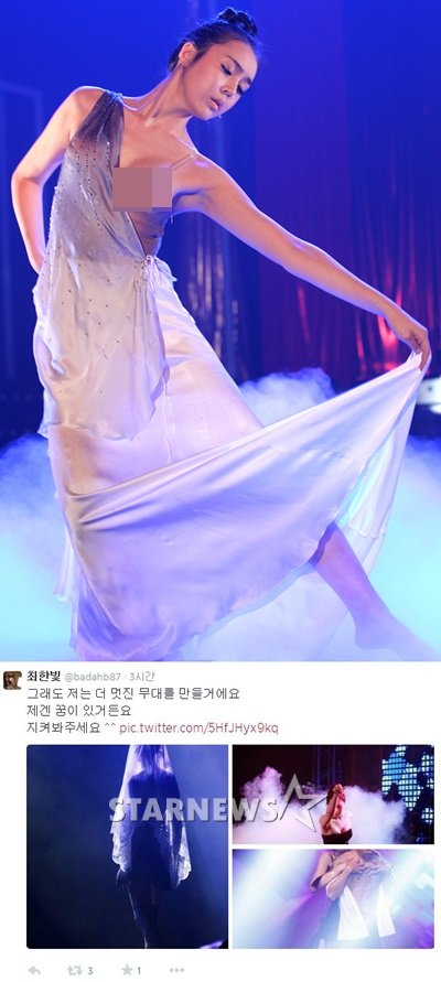 최한빛은 21일 오전 11시께 자신의 트위터에 "그래도 저는 더 멋진 무대를 만들 거예요. 제겐 꿈이 있거든요. 지켜봐주세요^^"라는 글과 함께 무대 위 자신의 공연 모습이 담긴 사진을 공개했다.