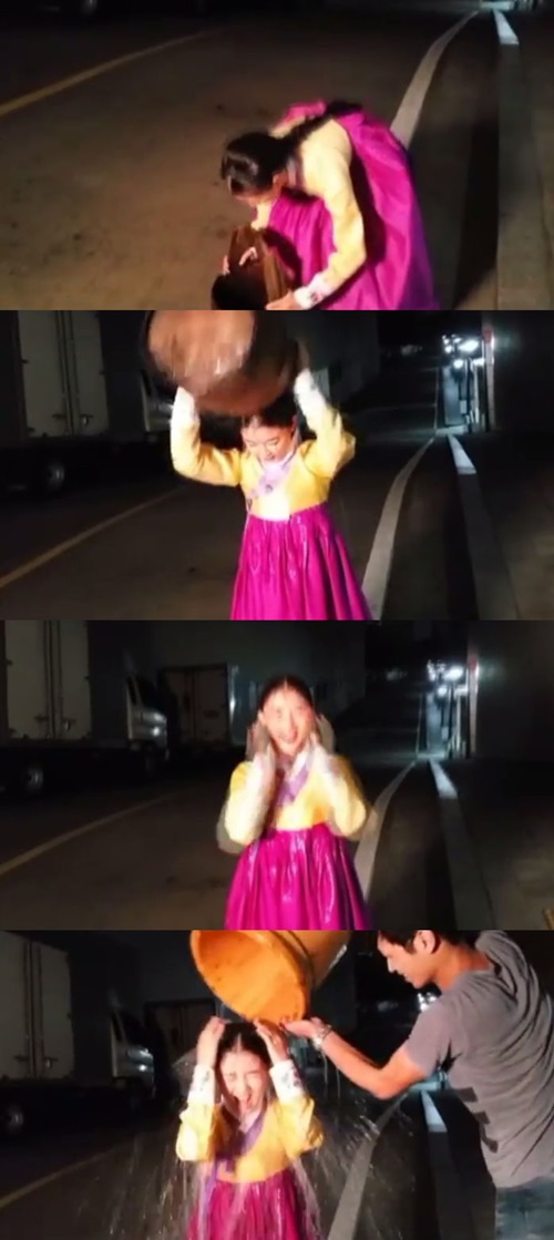 김유정이 21일 SBS '비밀의 문' 촬영장에서 아이스버킷 챌린지 캠페인에 동참하고 있다. /사진=싸이더스HQ 공식 유튜브 채널