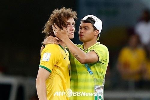2014 브라질월드컵 준결승전에서 독일에 브라질이 7대 1 대패 후 다비드 루이스(왼쪽)를 위로하는 티아고 실바(오른쪽). /AFPBBNews=뉴스1