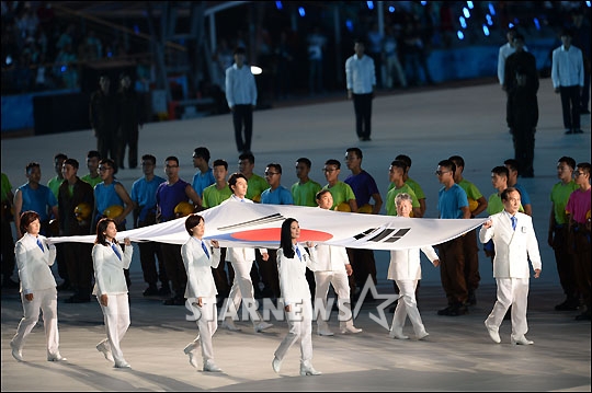 배우 현빈이 19일 오후 인천아시아드주경기장에서 열린 '2014 인천 아시안게임 개막식'에서 태극기와 함께 입장하고 있다.