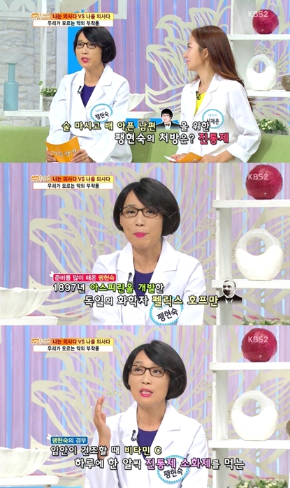 팽현숙은 "호주에 있을 때 유명한 진통제를 하루에 진통제 여섯 알씩 먹었다. 남편(최앙락)이 배가 아프다고 할 때도 진통제를 먹인다. 아무것도 필요 없다. 만병통치약이다"라며 약에 대한 깊은 애착을 드러냈다.