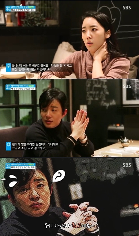 이범수는 "공부하러 만났는데 공부해야지"라고 퉁명스레 말했지만 곧 "아내와 영어수업을 통해 겪을 수록 소위 말하는 된장녀가 아니었다. 소신 있고, 검소하다"고 칭찬을 시작했다.