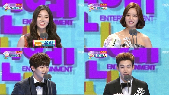 신인상의 주인공은 핫한 대세 남녀였다. 혼을 쏙 빼는 앙탈 애교로 단번에 대세에 등극한 '일밤-진짜 사나이' 여군특집의 히로인 혜리, '우리 결혼했어요'에서 활약 중인 유라 등 걸스데이 두 멤버가 여자 신인상을 받았으며, '우리 결혼했어요'의 매력남 송재림과 '일밤-진짜 사나이'의 군대 무식자 헨리가 남자 신인상을 거머쥐었다.