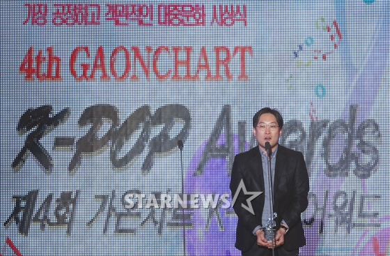 28일 오후 서울 송파구 방이동 올림픽공원 체조경기장에서 열린 '제4회 가온차트 K-POP 어워드'에서 뮤직디스트리뷰션상을 수상한 이인섭 유니버셜뮤직 이사가 소감을 말하고 있다.