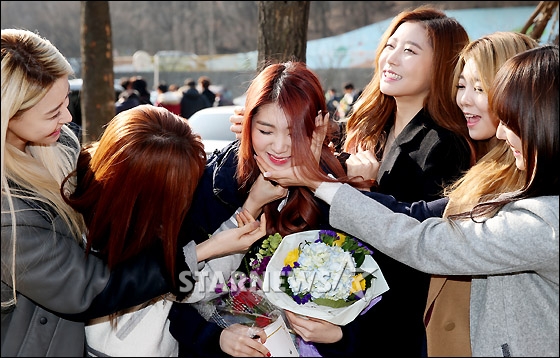 그룹 헬로비너스 여름이 6일 오전 서울 동작고등학교에서 열린 졸업식을 마친 뒤 멤버들에게 축하를 받고 있다.