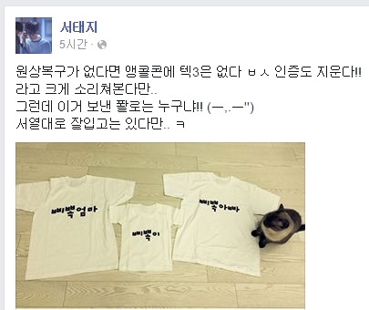 한편 서태지는 이와 함께 페이스북에 티셔츠 3벌이 나란히 놓여 있는 사진 두 장을 게재하고 "그런데 이거 보낸 퐐로(서태지가 팬들을 부르는 애칭 버팔로의 줄임)는 누구냐"며 "서열대로 잘 입고는 있다만"이라고 너스레를 떨었다.