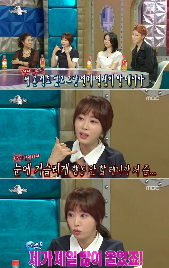 지난 18일 오후 방송된 MBC 예능 프로그램 '황금어장-라디오스타'(이하 라디오스타)는 '니들이 군대 맛을 알아?' 특집으로 진행됐다. '진짜 사나이-여군특집'에서 활약한 배우 김지영, 강예원, 박하선 개그우먼 안영미가 게스트로 출연했다. 이 가운데서도 '눈물의 아로미' 강예원은 조금 엉뚱해도 할 말은 다 하는 모습으로 시선을 집중시켰다.