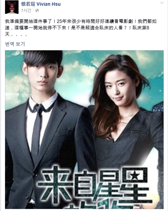 대만 스타 비비안수(40)가 드라마 '별에서 온 그대' 앓이를 인증했다.