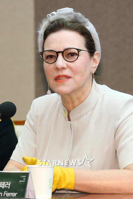 카린 호퍼 헵번 페러가 9일 오전 서울 중구 한국프레스센터에서 열린 '세월호 기억의 숲 조성 기자 간담회'에서 취재진 질문에 답하고 있다.