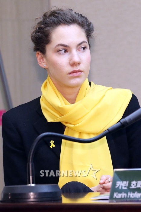 엠마 캐슬린 페러가 9일 오전 서울 중구 한국프레스센터에서 열린 '세월호 기억의 숲 조성 기자 간담회'에서 취재진 질문을 기다리고 있다.