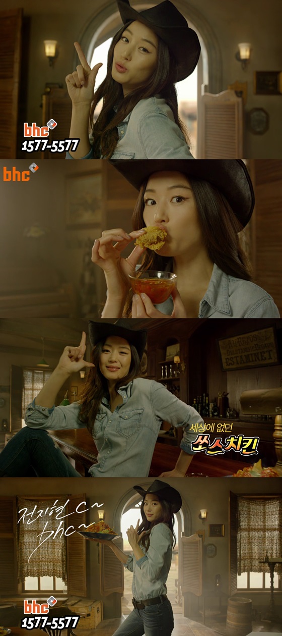 전지현은 21일 공개된 치킨 프랜차이즈 bhc CF에서 서부 영화 속 카우걸로 등장했다.