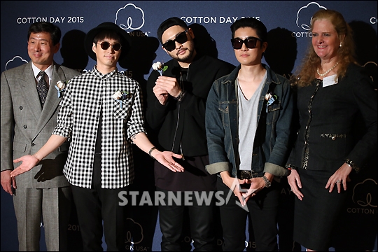 그룹 에픽하이가 12일 오후 서울 중구 웨스틴조선호텔에서 열린 '미국면화협회, 코튼데이 2015'에 참석해 김준 대한방직협회 회장과 카린 말스트롬 미국면화협회 중국 및 동아시아 담당이사와 함께 포즈를 취하고 있다.