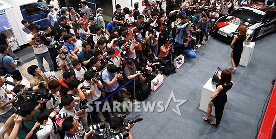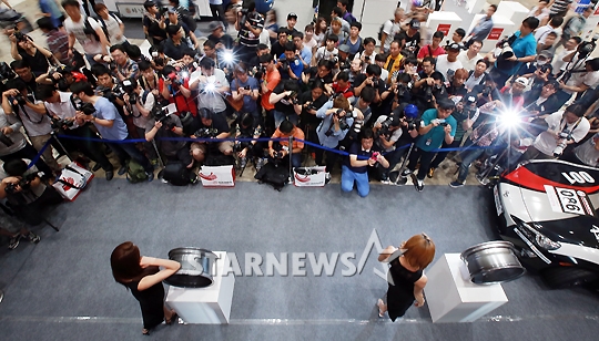 레이싱 모델 주다하, 허윤미가 9일 오전 서울 강남구 삼성동 코엑스에서 열린 '2015 서울오토살롱'에서 포즈를 취하고 있다.