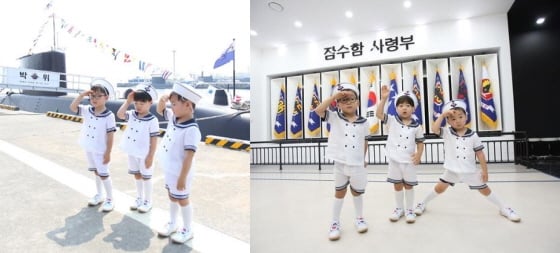 배우 송일국은 삼둥이와의 의미 있는 사진을 공개했다. "광복절을 맞아 할아버지배(?) 만나러 온 대한민국만세~^^ (안타깝게 김좌진함은 훈련 중 T.T)"이라는 글과 삼둥이의 모습을 담은 사진을 공개했다. 공개된 사진에서 삼둥이는 해군 복장을 하고 잠수함 앞에서 거수경례를 하고 있다. 청산리대첩을 승리로 이끈 독립군 김좌진 장군의 후손답게 늠름한 모습을 보여 눈길을 끌고 있다. 송일국이 삼둥이와 함께 보러 간 김좌진함은 김좌진 장군의 이름을 딴 김좌진 장군의 외증손자다.