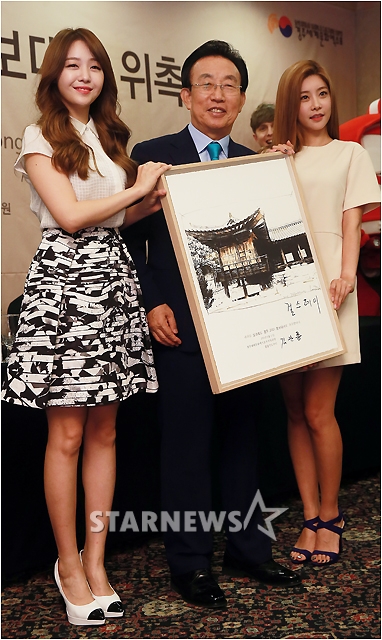 걸스데이 민아, 소진이 17일 오후 서울 영등포구 여의도동 켄싱턴호텔에서 열린 '실크로드 경주 2015 ' 홍보대사 위촉식에서 김관용 경북도지사와 포즈를 취하고 있다.