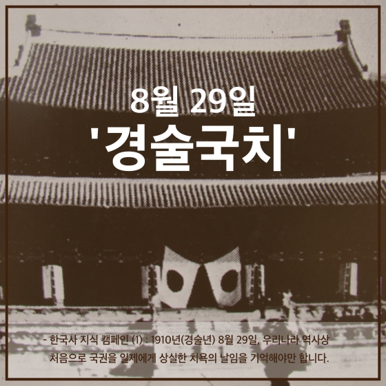경복궁 근정전에 꽂힌 일장기의 모습을 배경으로 '1910년 8월 29일, 우리나라 역사상 처음으로 국권을 일제에게 상실한 치욕의 날을 기억하자'라는 설명이 들어가 있다.