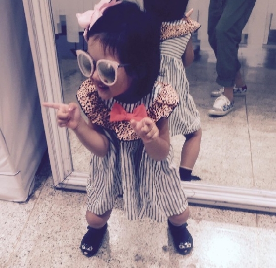 엄태웅 아내 윤혜진은 7일 오후 "엄지온 왜 이러나? 선글라스 하나 걸쳐 쓰고 혼자 신명나심. 아 용녀용녀"라는 글과 함께 한 장의 사진을 게재했다.