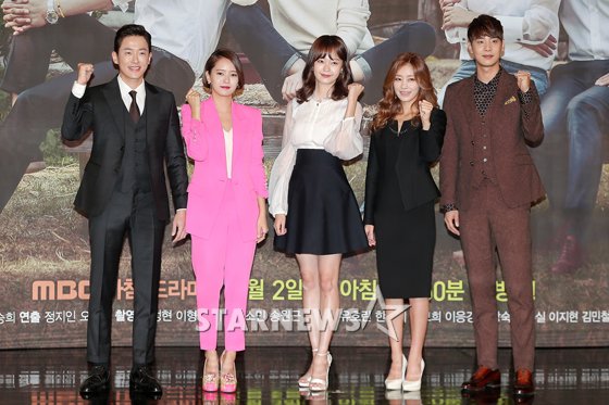 배우 최필립, 유호린, 전소민, 이지현, 송원근(왼쪽부터)이 29일 오후 서울 마포구 MBC 상암신사옥 골든마우스홀에서 열린 MBC 새 아침드라마 '내일도 승리' 제작발표회에 참석해 포즈를 취하고 있다.