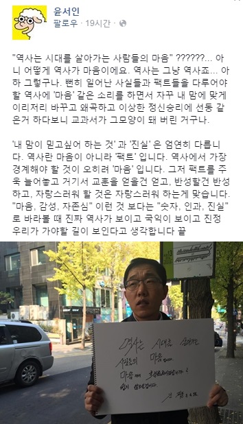 윤서인은 3일 자신의 페이스북에 "역사는 시대를 살아가는 사람들의 마음? 아니 어떻게 역사가 마음이에요. 역사는 그냥 역사죠"라고 적었다.