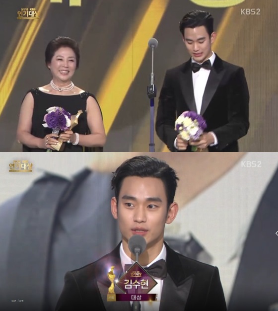 김수현은 수상 후 "우선은 서수민 CP님, 박지은 작가님, 표민수 감독님, 차태현 선배님, 공효진 선배님, 아이유 씨, 함께 고생하신 동료 선후배 배우들, 스태프 너무 너무 감사하다"며 "키이스트 회사 식구들, 제가 사랑하는 가족들, 언제나 감사드립니다. 예전에 도민준 씨로 크나큰 사랑을 받고 나서 프로듀사에서 백승찬이란 다른 역할을 맡으면서 많은 걱정을 했던 것 같다"고 말했다.