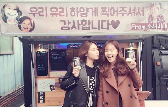 사진 속 수영과 유리는 수영이 제공한 카페 트럭 앞에서 발랄한 표정으로 눈을 감고 커피를 들고 있다. 카페 트럭에는 '우리 유리 하얗게 찍어주셔서 감사합니다♡'라는 플래카드가 걸려있다.